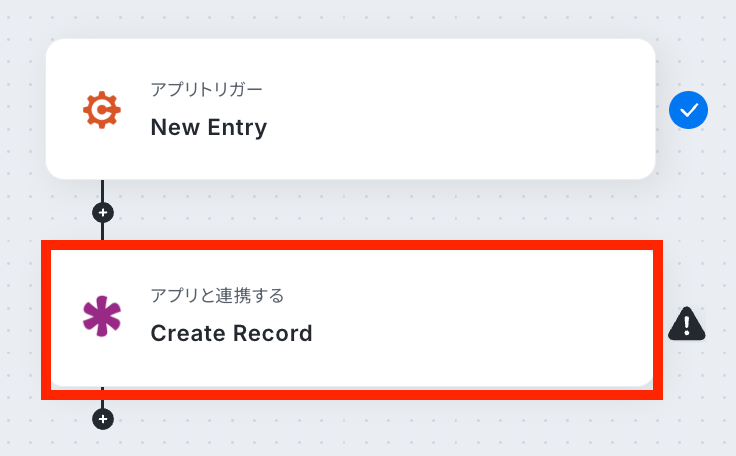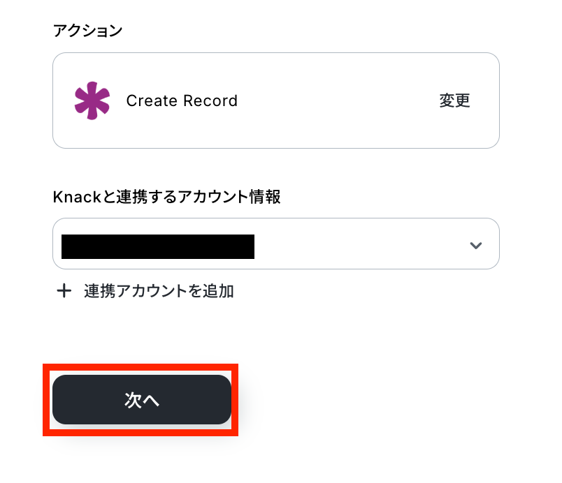 取得した値を利用してKnackでRecordを作成する設定を行います。2つ目の赤枠をクリックしましょう!