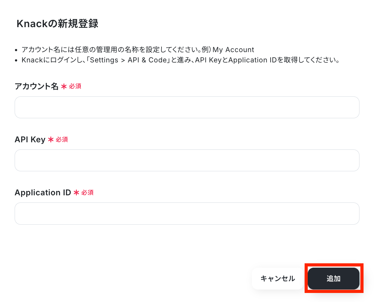任意のアカウント名とAPI Key、Application IDを記入して、「追加」ボタンをクリックします。