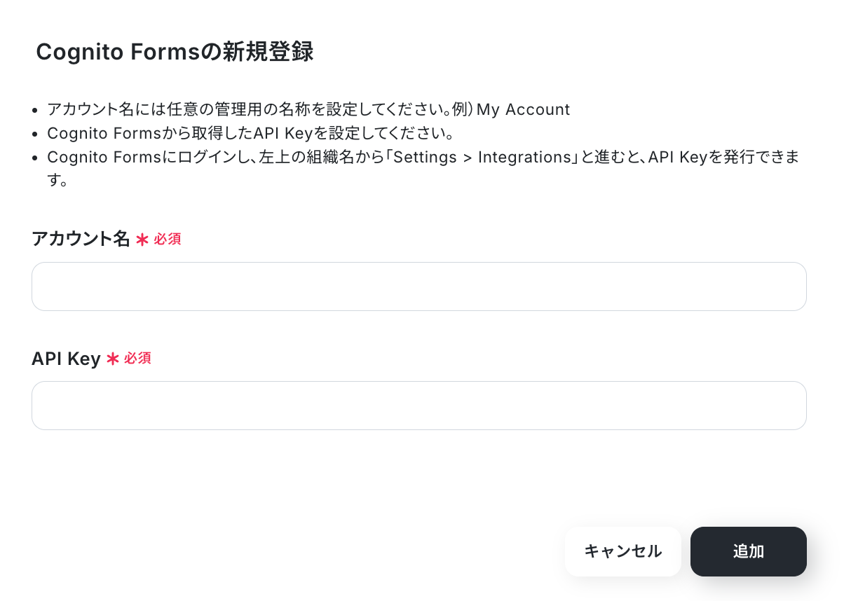 任意のアカウント名とAPI Keyを記入して、「追加」ボタンをクリックします。