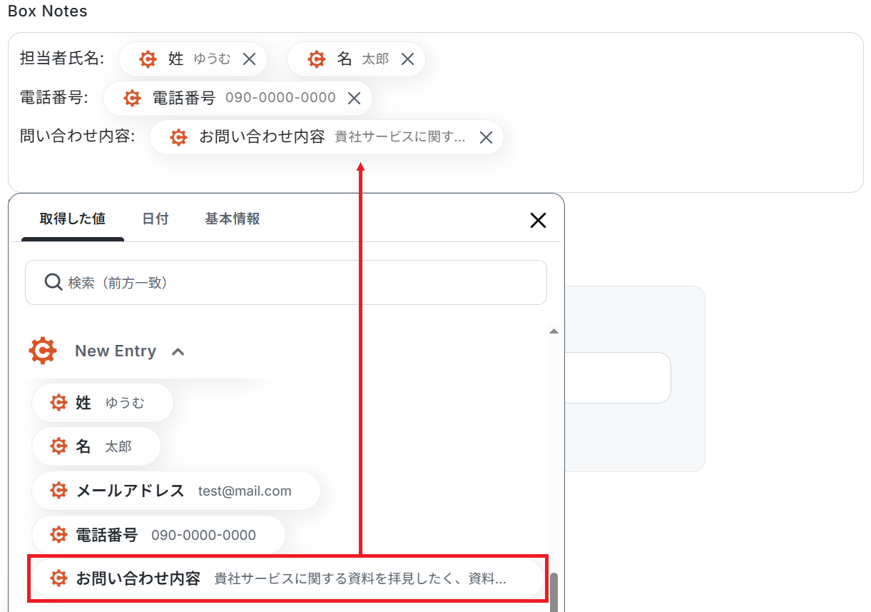 続けて、Box Notes も設定しましょう。 Cognito Formsから取得した値や、固定のテキストを組み合わせて自由にカスタマイズ可能です。