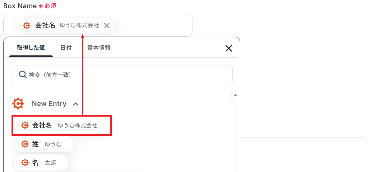 次にBox Name を設定しましょう。Cognito Formsから取得した「会社名」や「姓+名」などの値を設定することで、トリガーが実行されるたびに最新の回答内容を反映できます。
