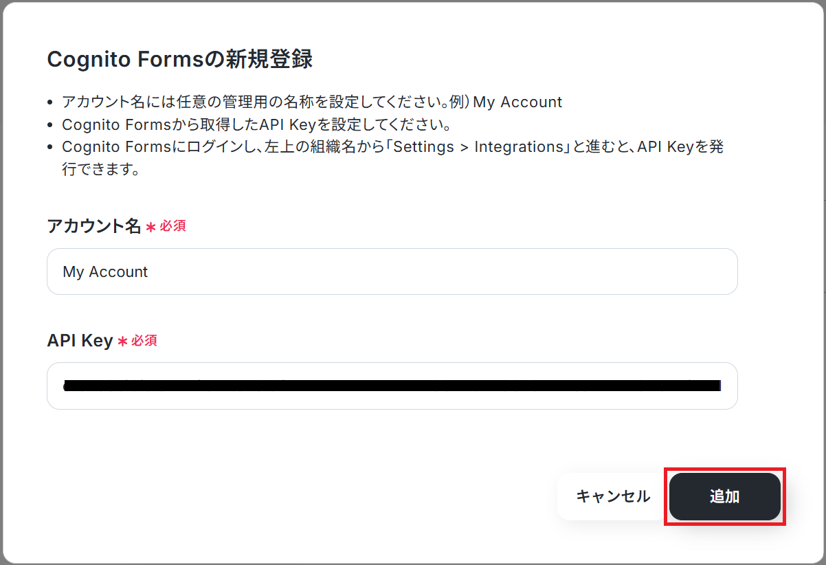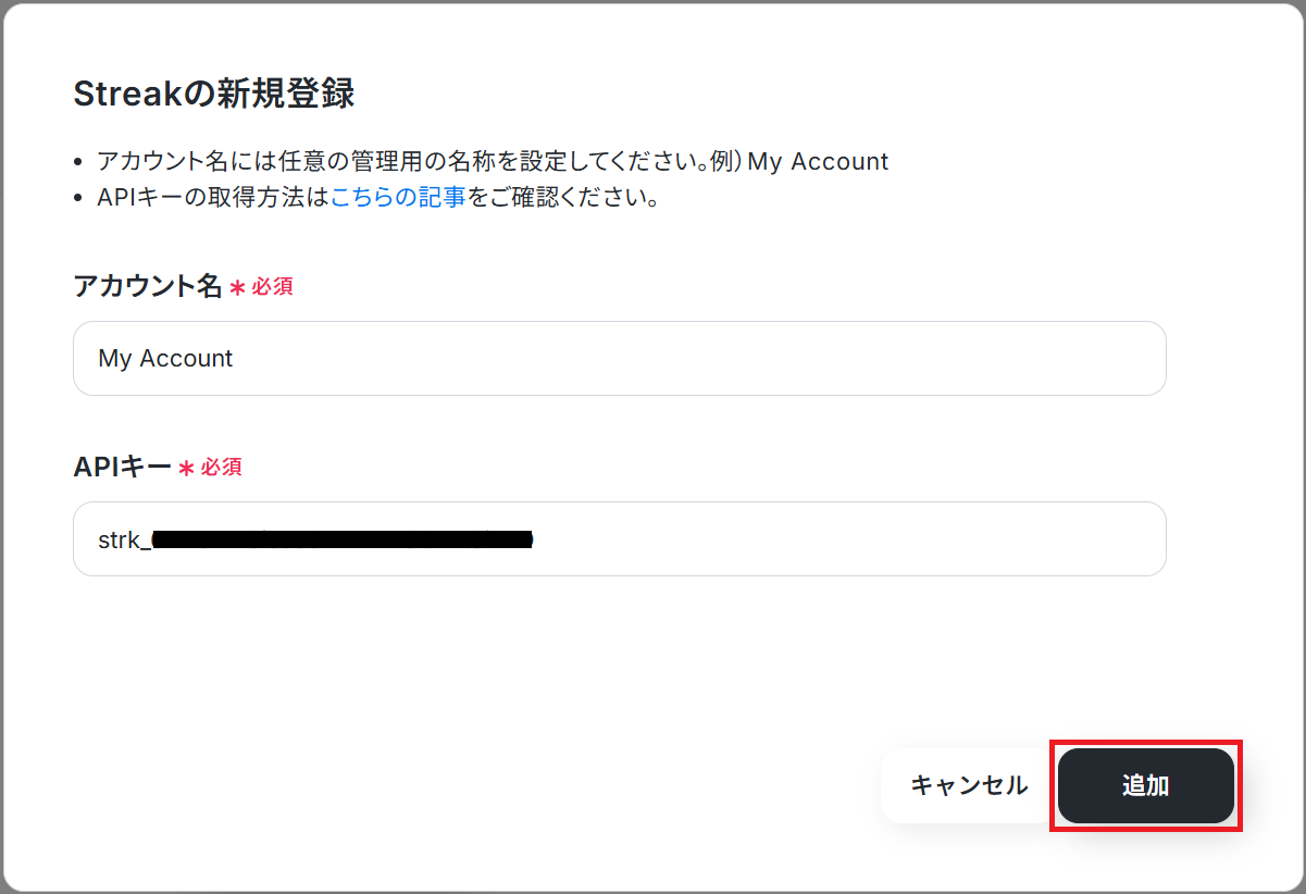 任意のアカウント名 と、先ほど作成したAPIキー を入力し「追加」をクリックするとマイアプリ連携完了です。