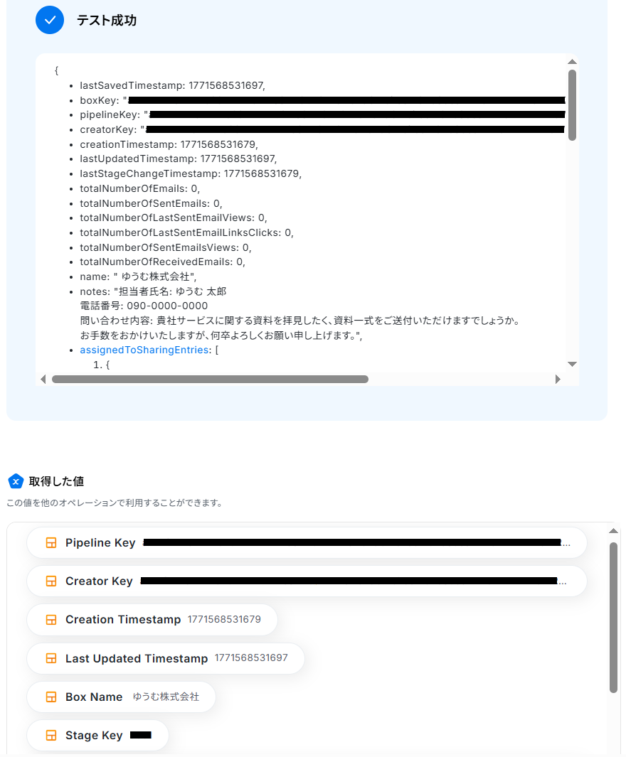 Cognito Forms、StreakのそれぞれとYoomを連携してください。 Cognito FormsのアウトプットはJSONPathから取得可能です。取得方法は「『取得する値』を追加する方法 」をご参照ください。