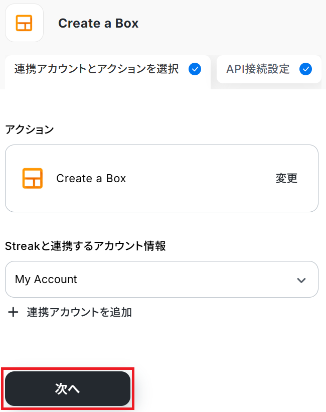 ステップ3と同様、アクションは「Create a Box」のまま「次へ」をクリックします。
