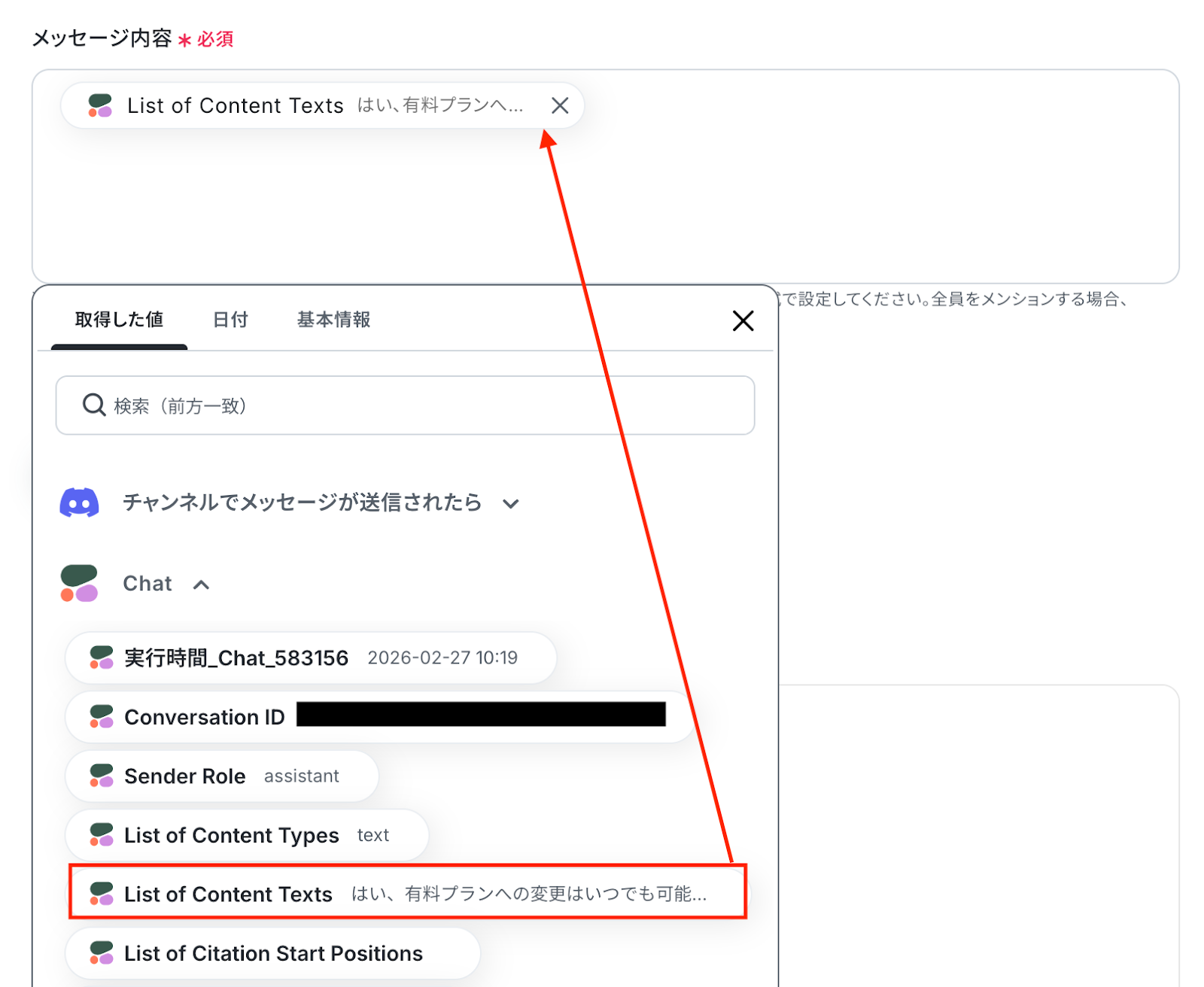 入力欄をクリックすると、前のステップで取得した値や日付タブが表示されるので、選択して入力可能です。