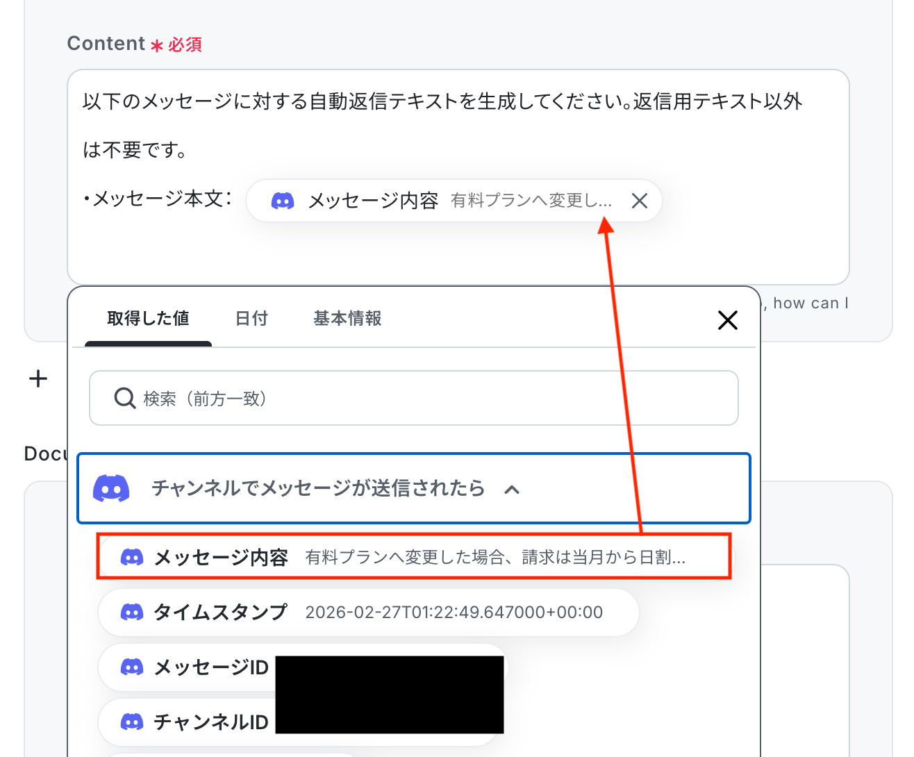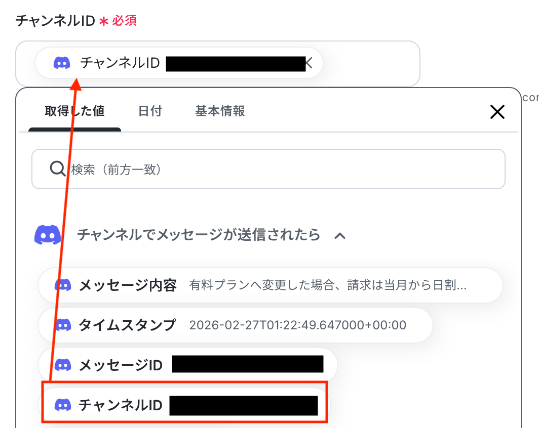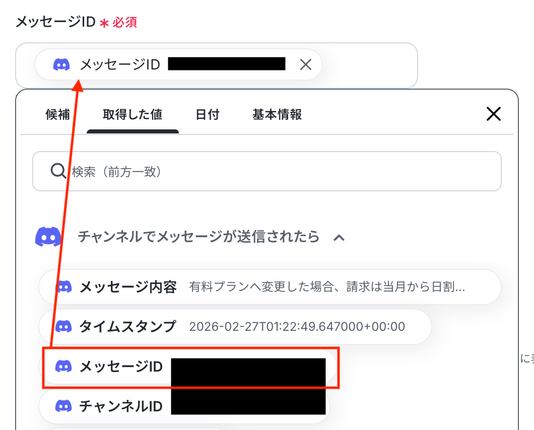 入力欄をクリックすると、前のステップでDiscordから取得した値が表示されるので、選択して入力してください。