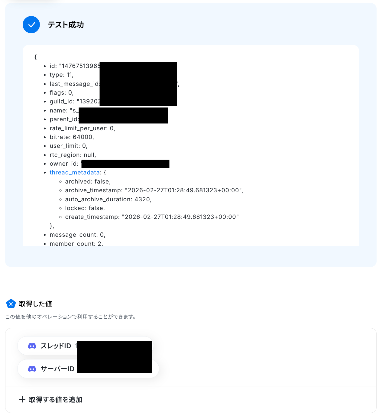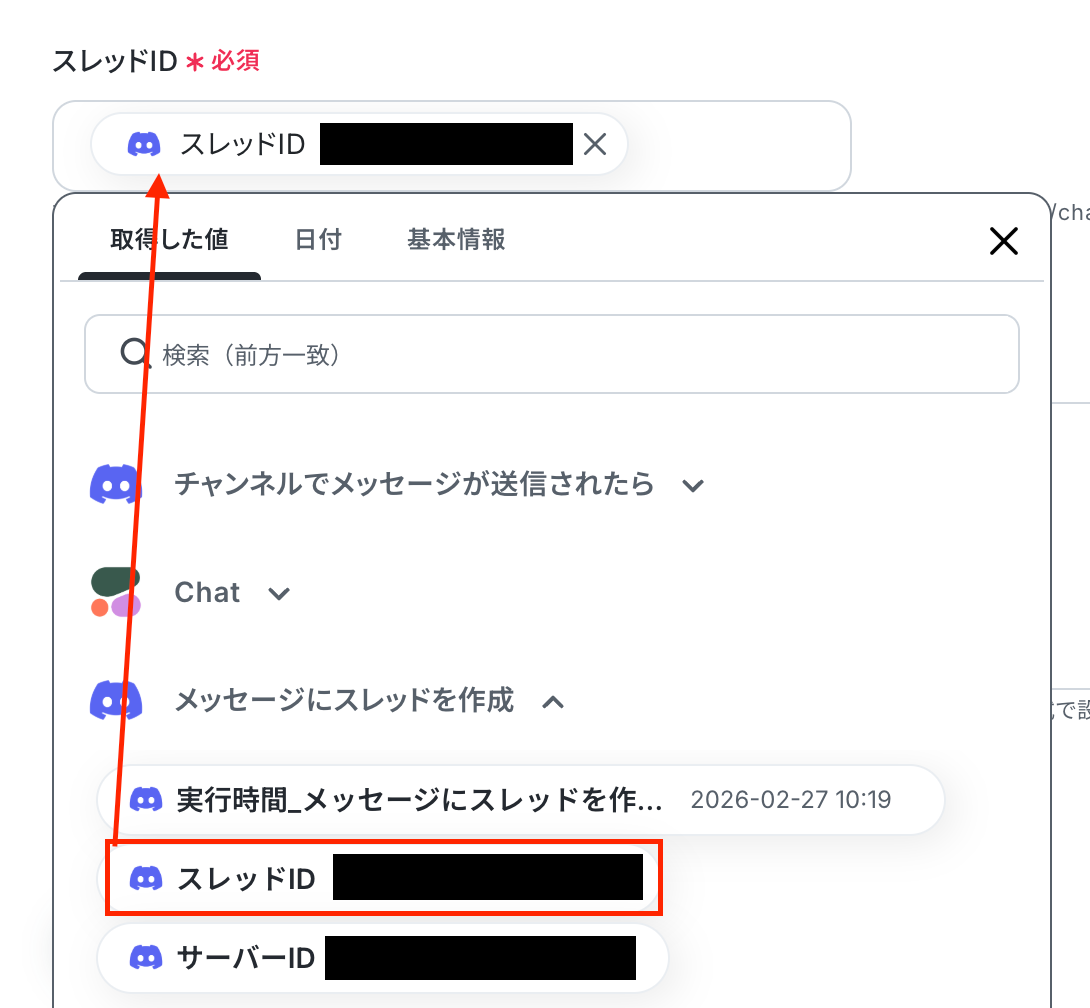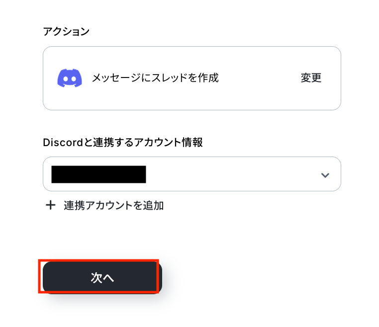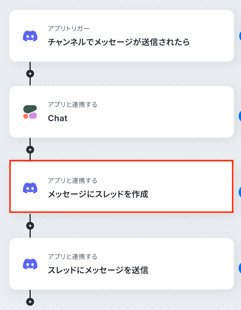 続いて、前のステップで取得した値を利用して、Discordのメッセージに通知用のスレッドを作成しましょう。