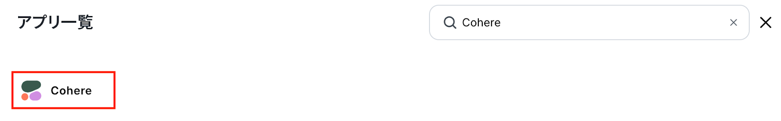 新規接続をクリックしたあと、アプリのメニュー一覧が表示されるのでCohereと検索し、対象アプリをクリックしてください。