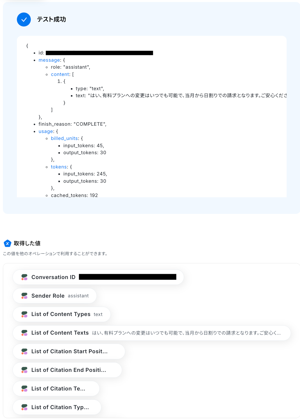 テストに成功すると、Cohereで生成された回答に関する情報が表示されます。
