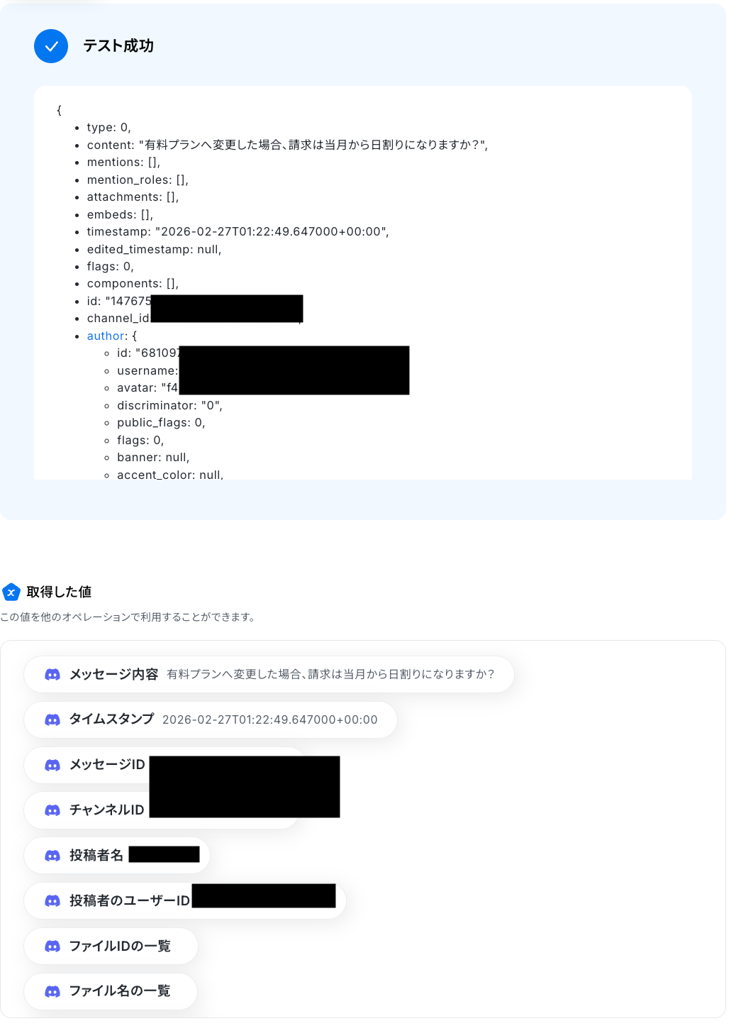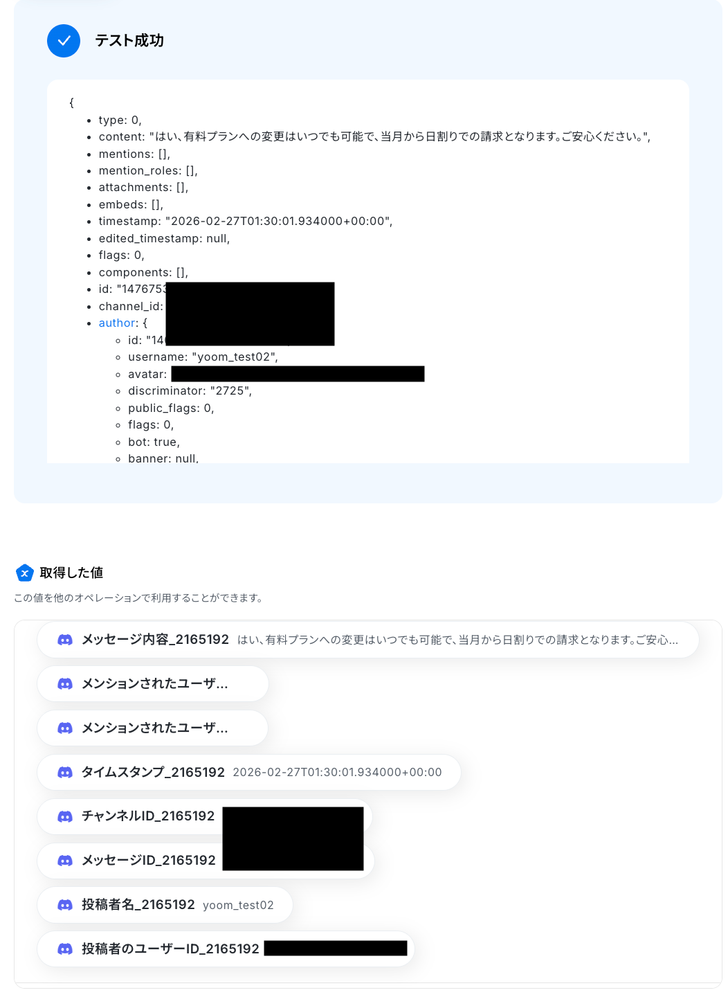 テストに成功すると、Discordに送信されたメッセージに関する情報が一覧で表示されます。
