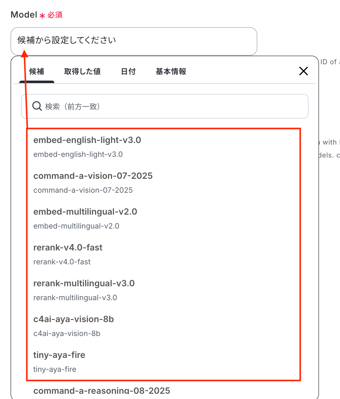 入力欄をクリックすると、前のステップでCohereから取得した値が表示されるので、選択して入力しましょう。