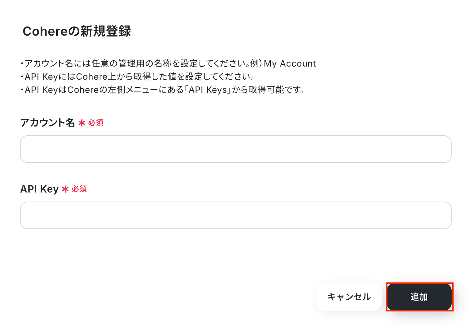 以下の画面が表示されるので、アカウント名とAPI Keyを注釈に沿って入力し、「追加」をクリックしましょう。