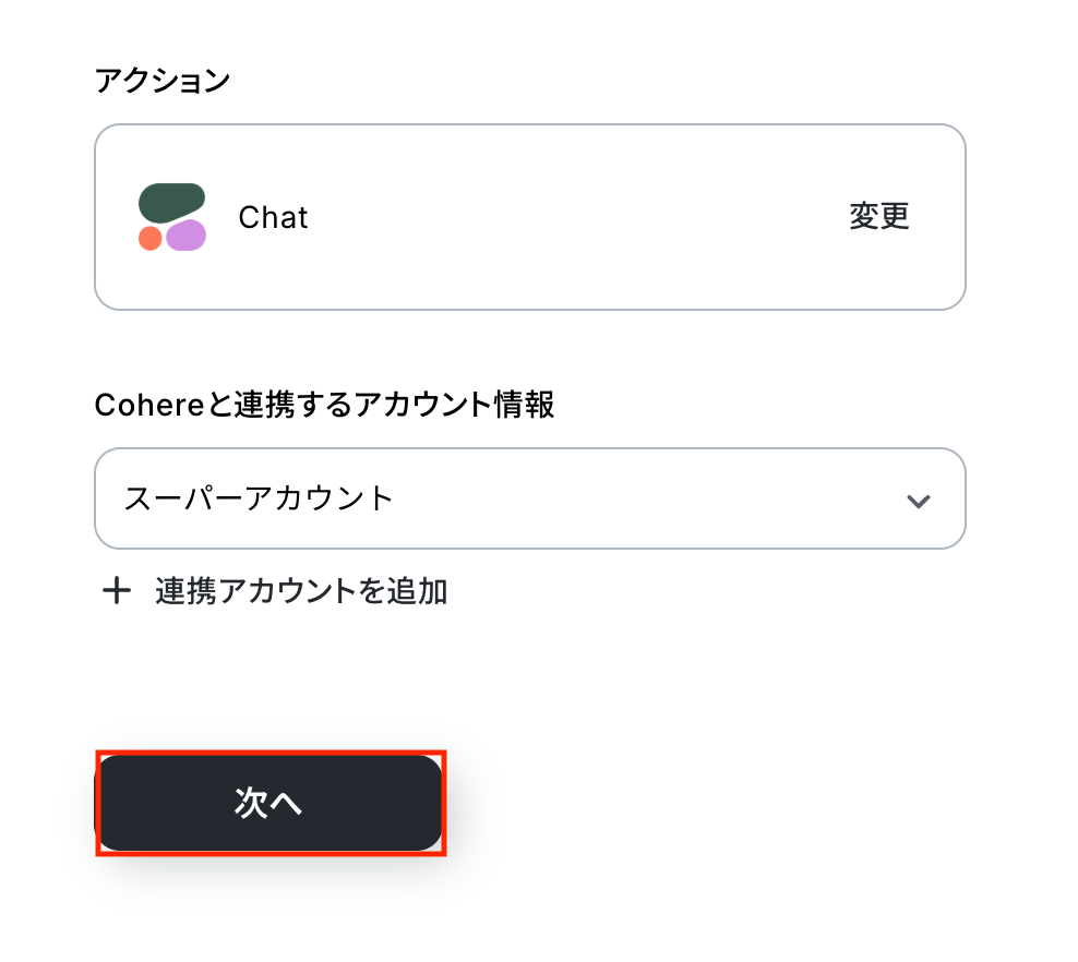 Cohereと連携するアカウント情報に問題がなければ、「次へ」をクリックします。