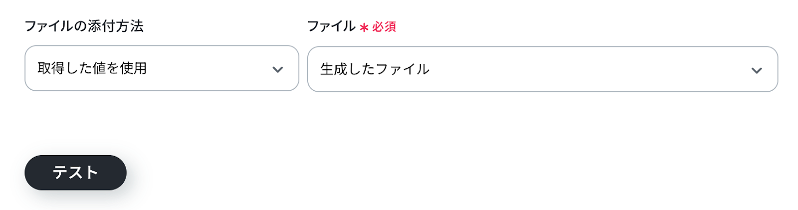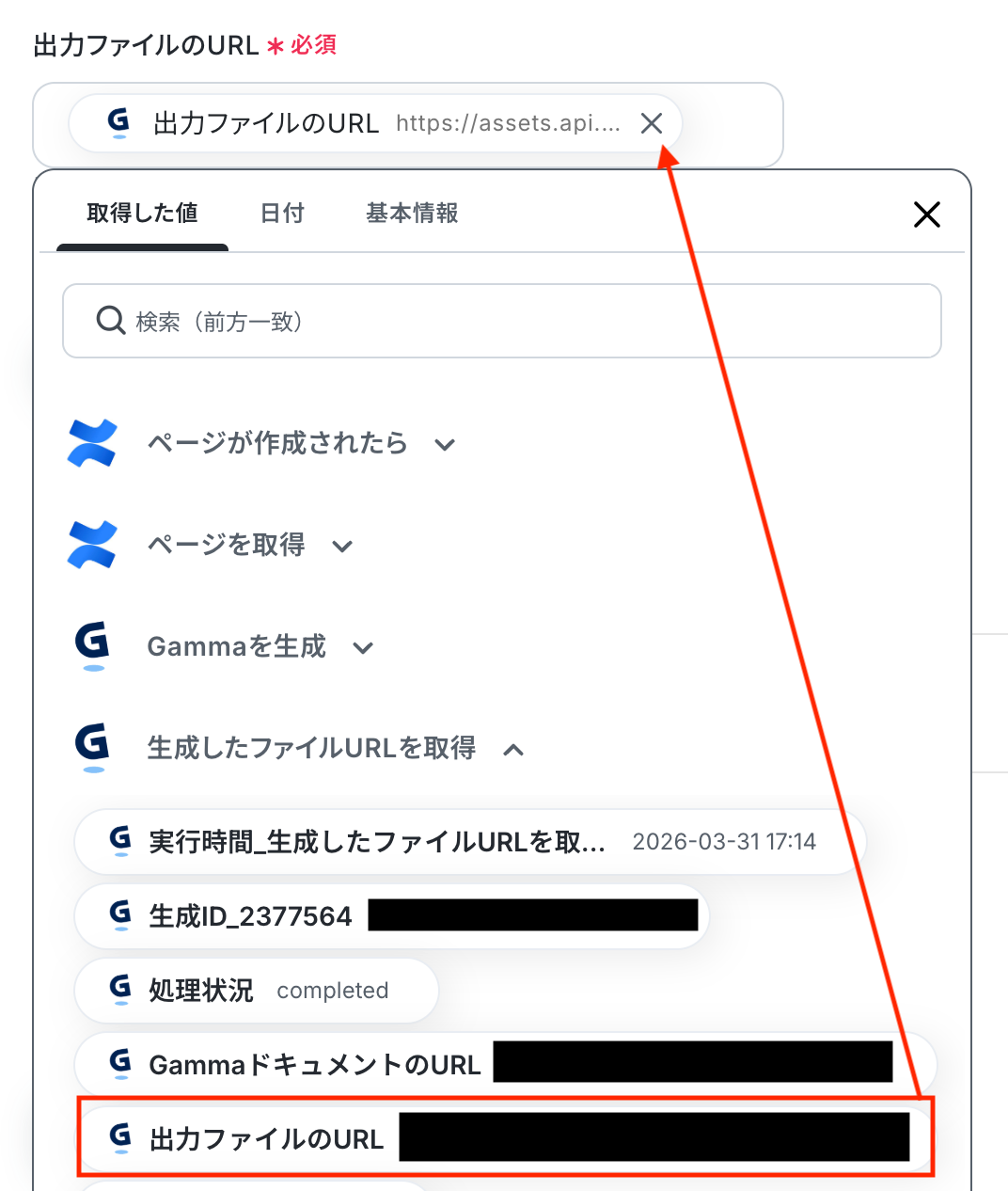 出力ファイルのURL 入力欄をクリックすると、前のステップでGammaから取得した値が表示されるので、選択して入力しましょう。 入力が完了したら「テスト」をクリックして、設定した内容で生成したファイルが取得されるか確認しましょう。