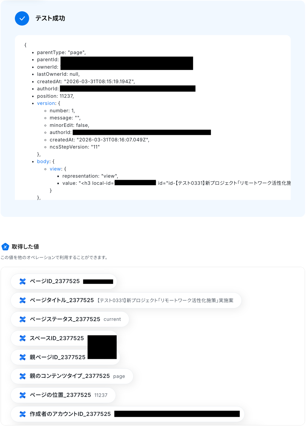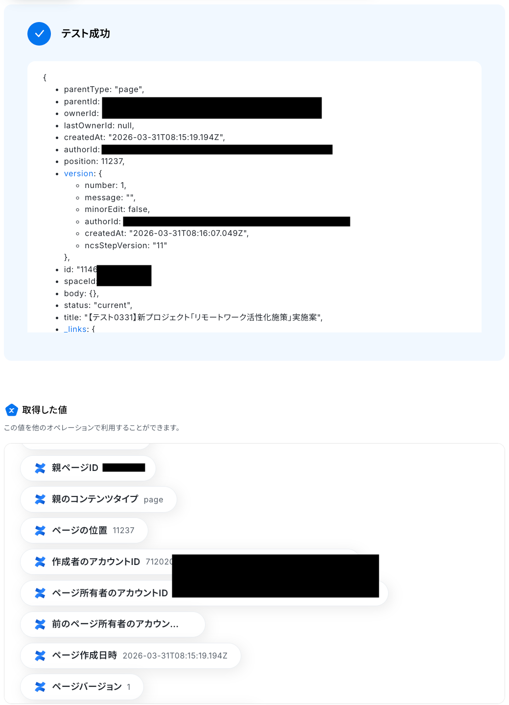 テストに成功すると、Confluenceに作成されたページに関する情報が一覧で表示されます。 以下の画像の取得した値を利用して、この後のステップでページ情報を取得できます。