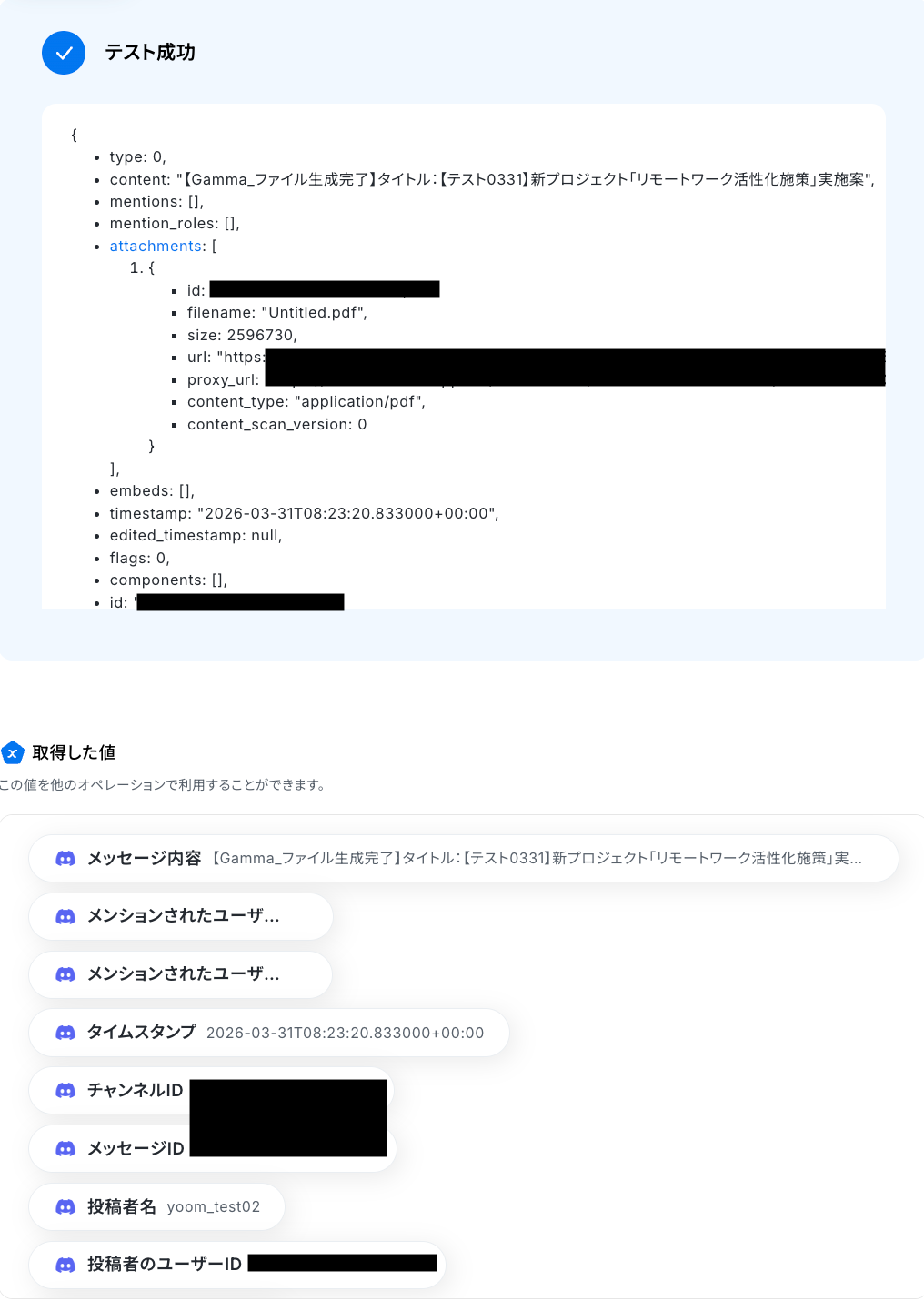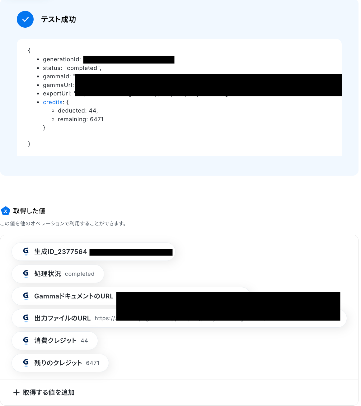 テストに成功すると、Gammaで生成された資料に関する情報が表示されます。 以下の取得した値はこの後のステップで利用できます。