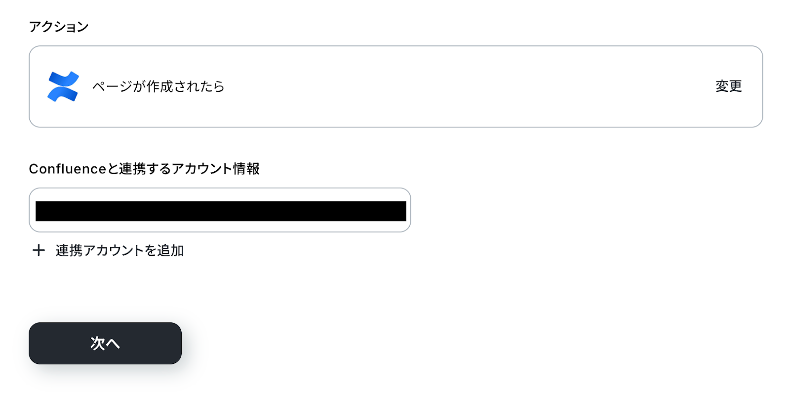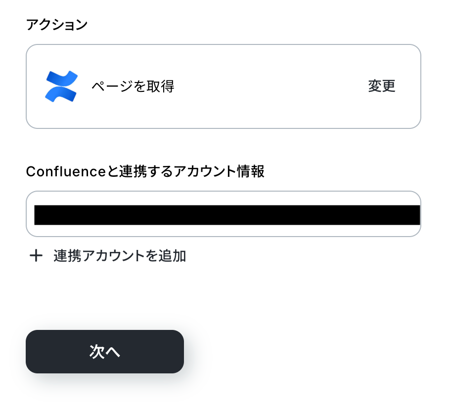 アクションはあらかじめ設定されているため、そのまま内容を確認してください。 Confluenceと連携するアカウント情報に問題がなければ、「次へ」をクリックします。