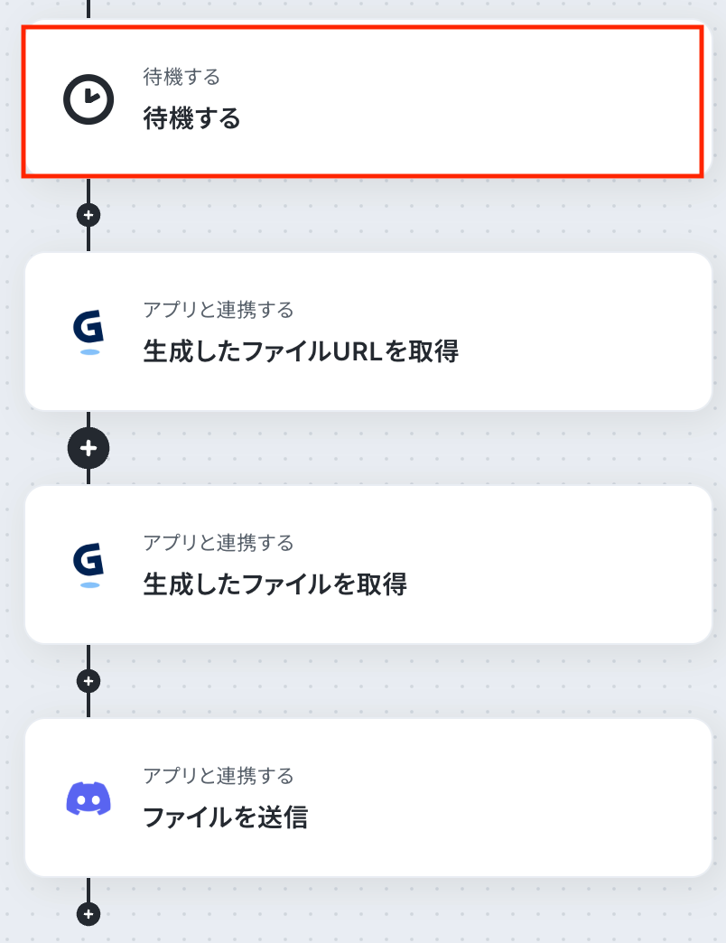 ステップ6:待機設定 続いて、Gammaでプレゼン資料を生成した後、生成処理の完了を待つため、「待機する」アクションを設定しましょう。 「待機する」をクリックします。