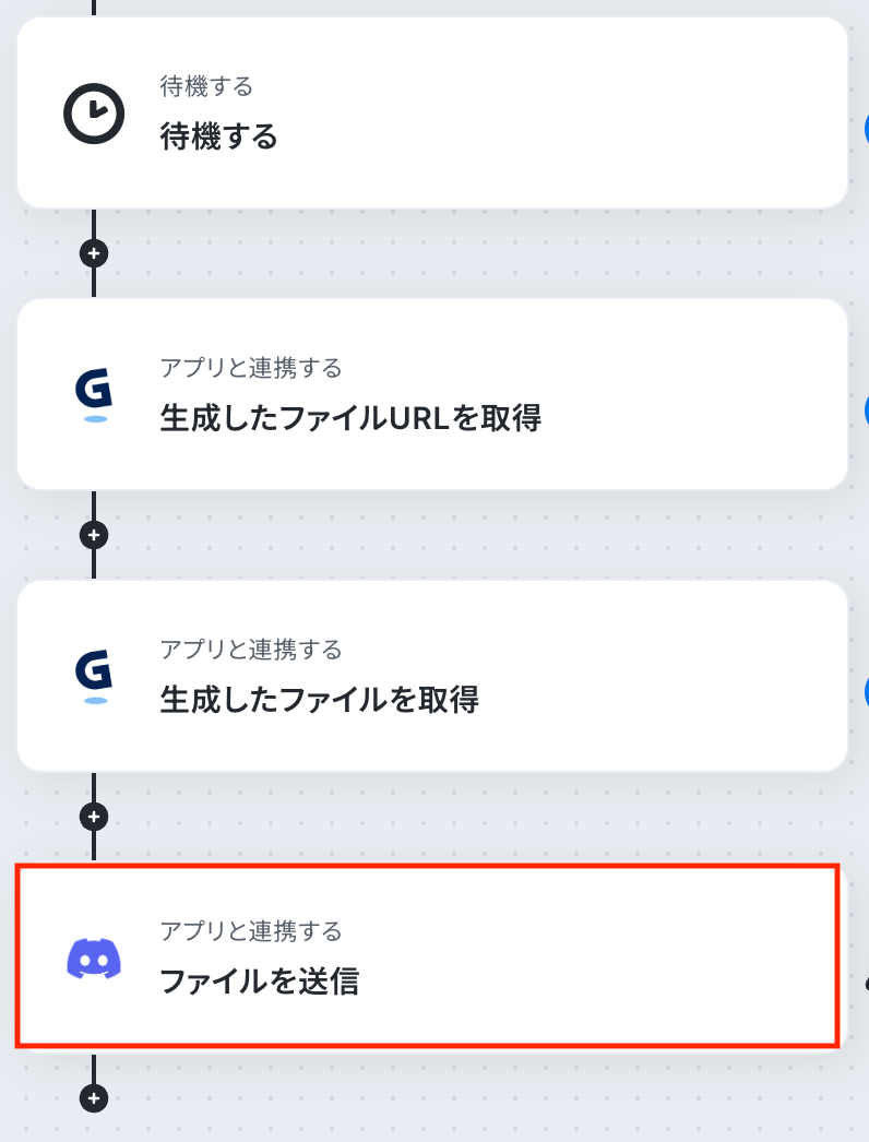 ステップ9:Discordでファイルを送信 いよいよ最後の設定です! 前のステップでGammaで生成したプレゼン資料を、Discordで送信する設定を行いましょう。 「ファイルを送信」をクリックします。