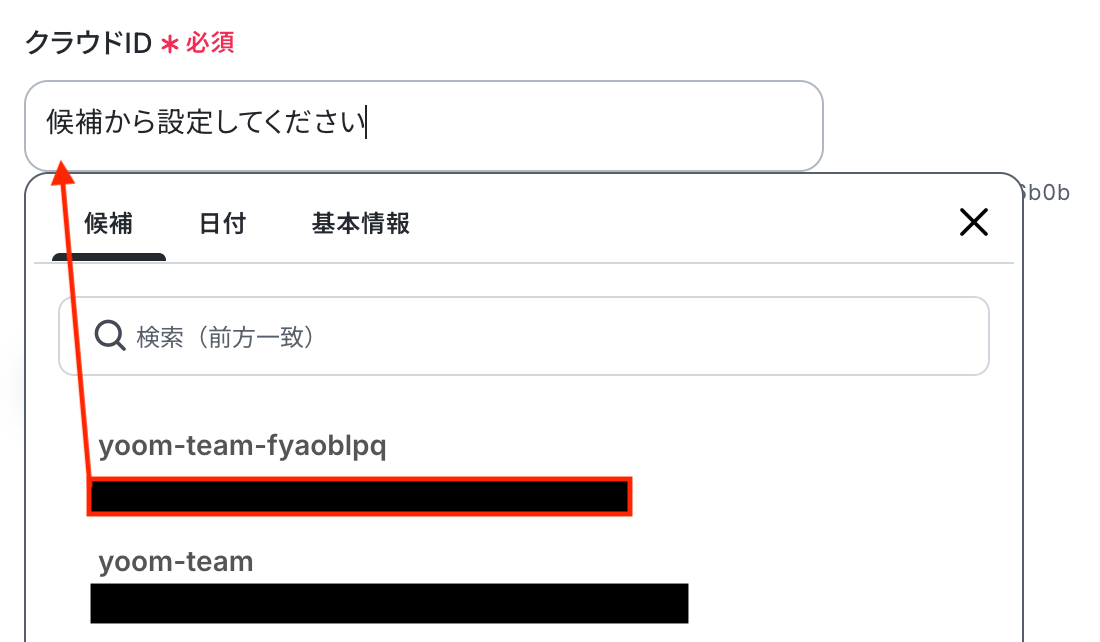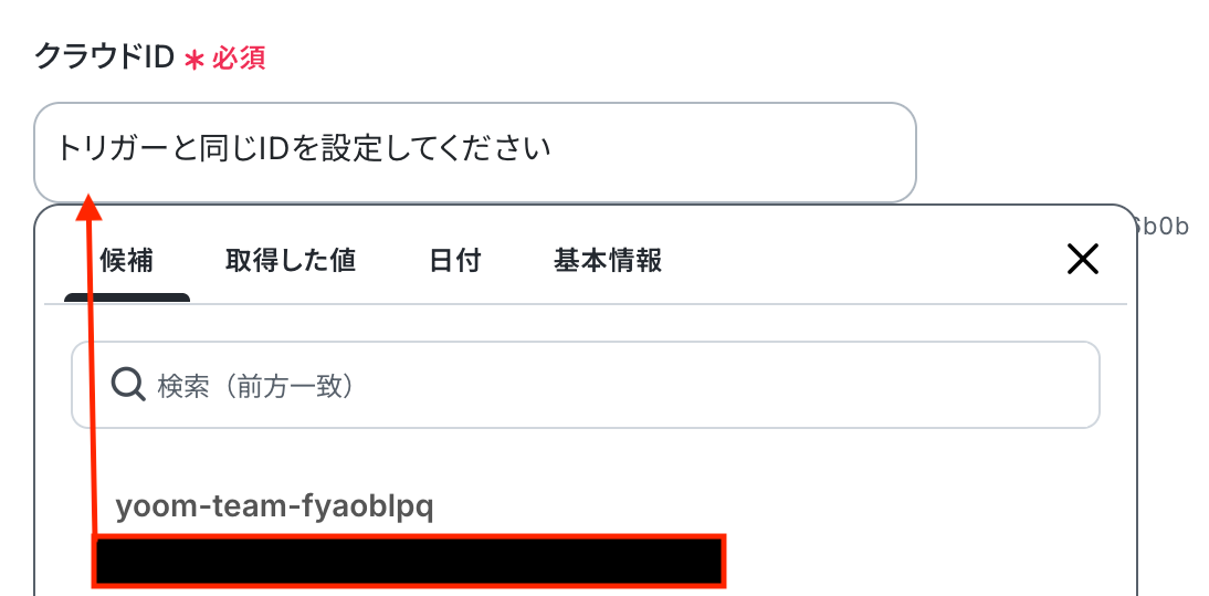 クラウドID 入力欄をクリックするとマイアプリ連携をしたアカウントから候補が表示されるので、対象の項目を選択しましょう。
