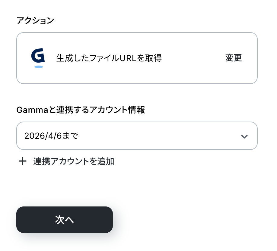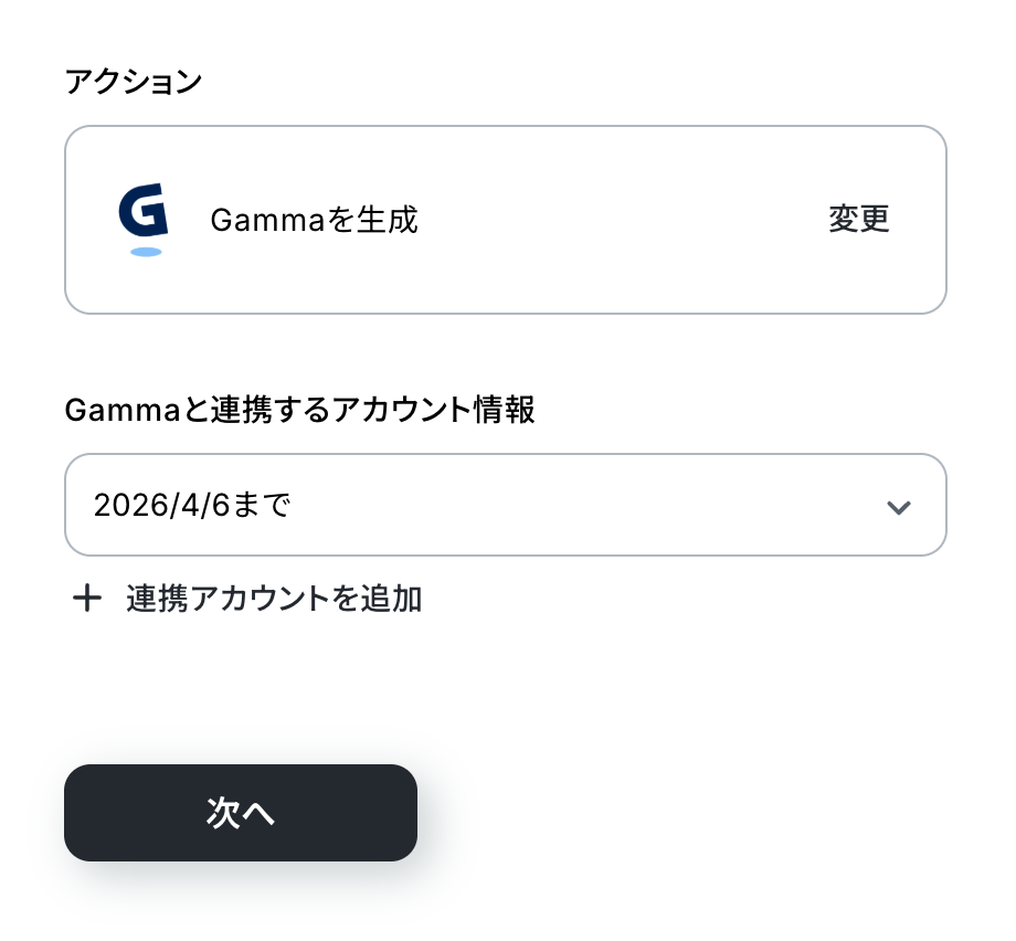 アクションはあらかじめ設定されているため、そのまま内容を確認してください。 Gammaと連携するアカウント情報に問題がなければ、「次へ」をクリックします。