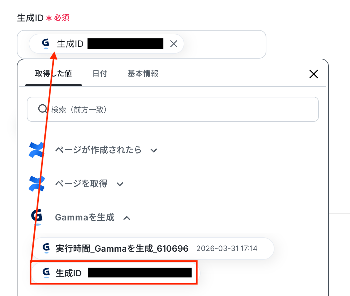 生成ID 入力欄をクリックすると、前のステップでGammaから取得した値が表示されるので、選択して入力しましょう。