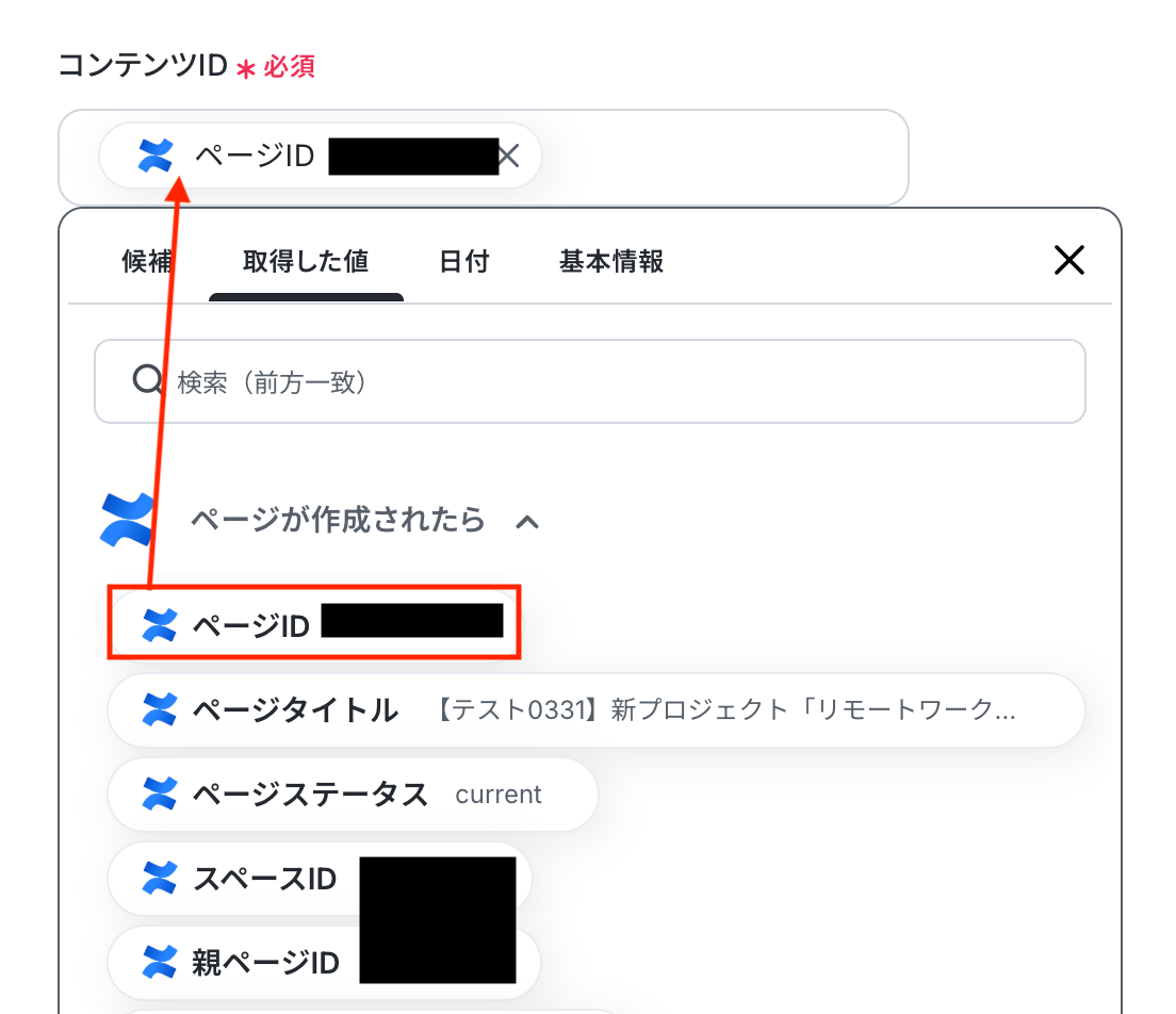 コンテンツID 入力欄をクリックすると、前のステップでConfluenceから取得した値が表示されるので、選択して入力しましょう。 取得した値を活用することで値が固定化されず、フローボットを起動するたびに最新の情報を自動で反映できます。