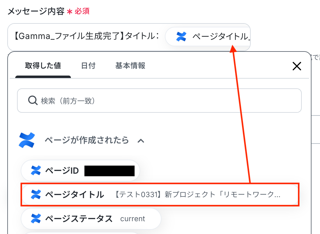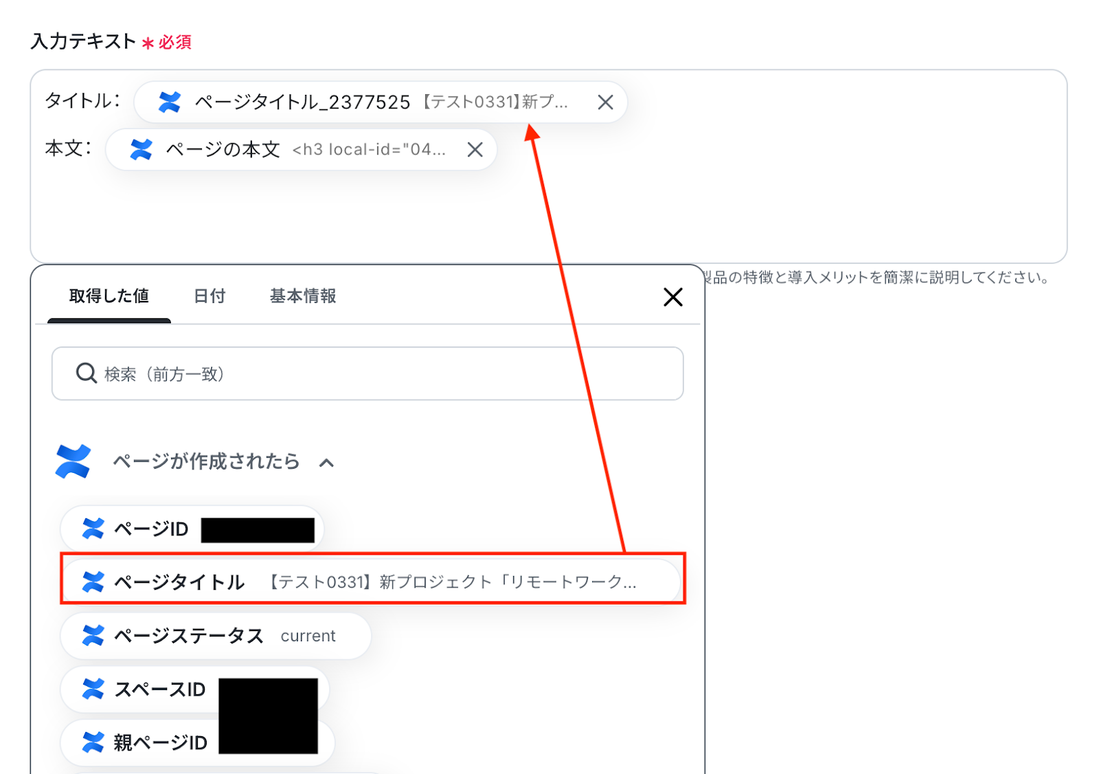 入力テキスト 入力欄をクリックすると、前のステップでConfluenceから取得した値が表示されるので、選択して入力しましょう。