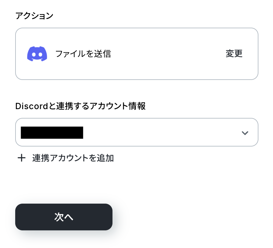 アクションはあらかじめ設定されているため、そのまま内容を確認してください。 Discordと連携するアカウント情報に問題がなければ、「次へ」をクリックします。