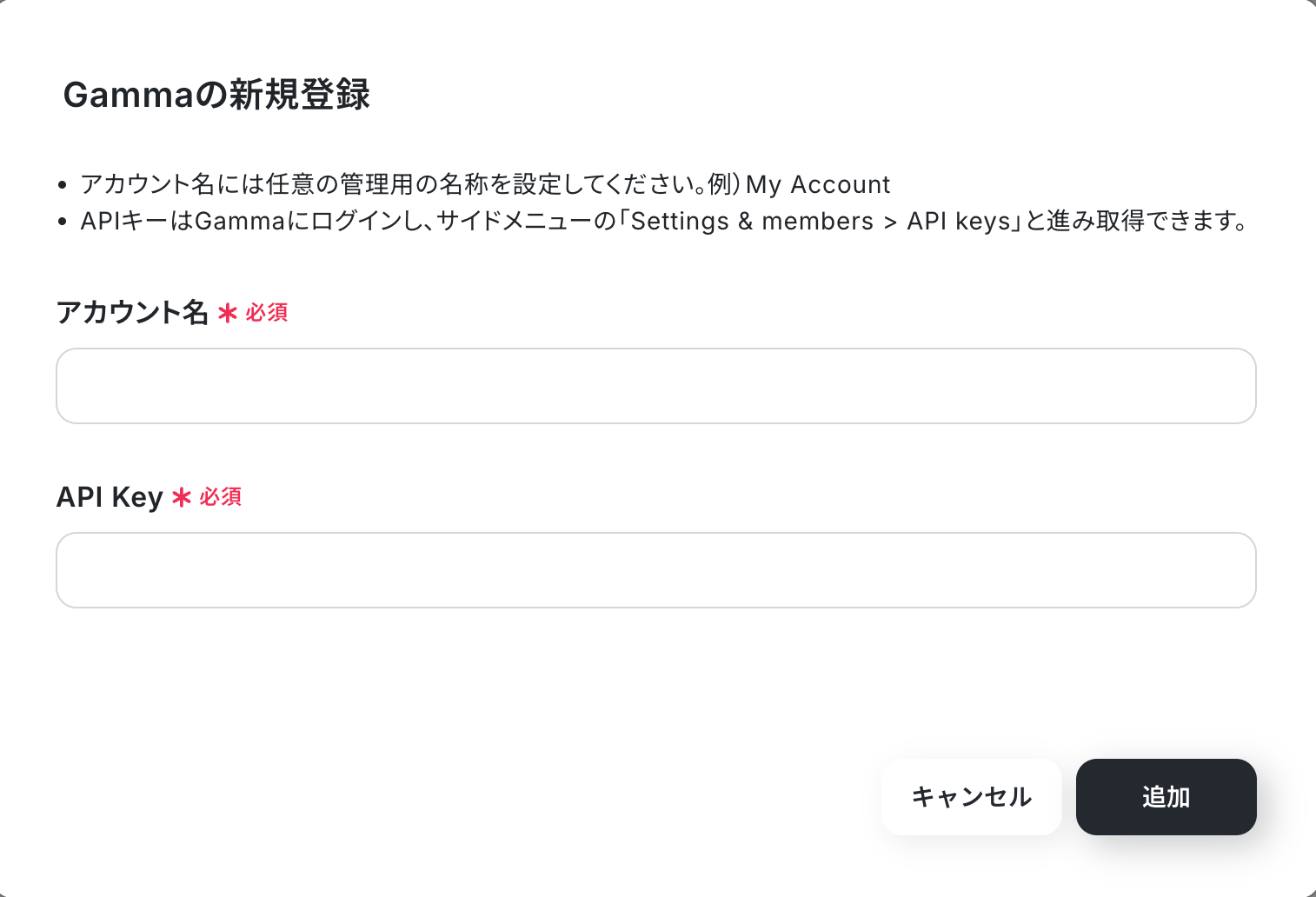 以下の画面が表示されるので、アカウント名とAPI Keyを注釈に沿って入力し、「追加」をクリックしましょう。