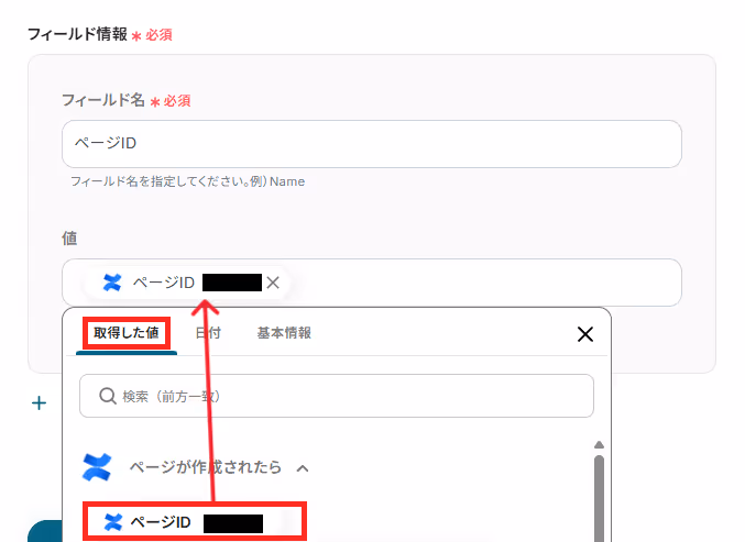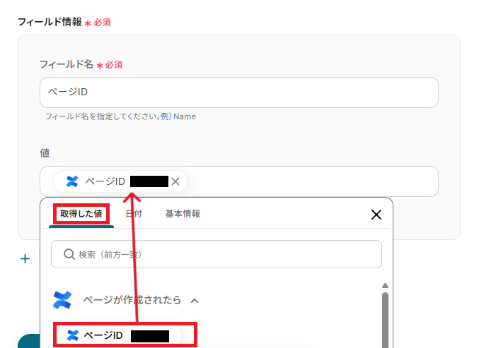 「値」は、フィールド名に合わせて取得した値から選択しましょう。