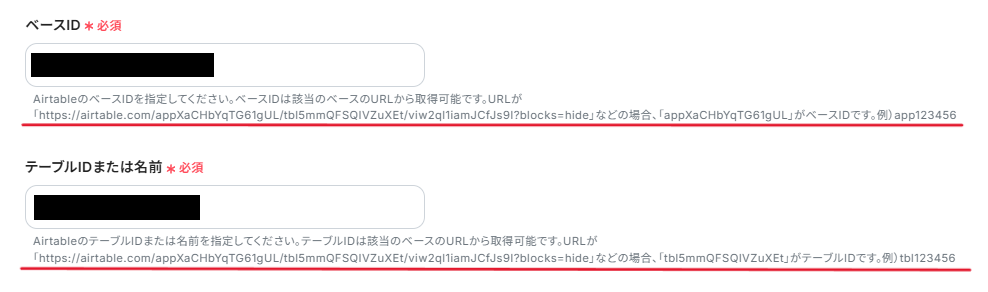 「ベースID」と「テーブルIDまたは名前」は、入力欄下の説明に従って入力してください。