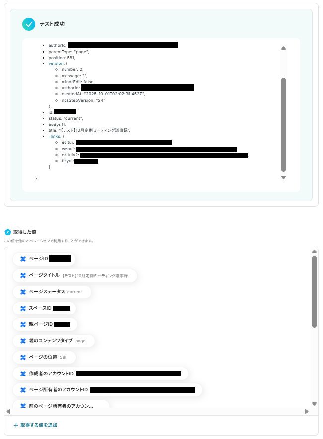取得した値は、トリガーやオペレーション設定時に、「テスト」を実行して取得した値のことを指します。