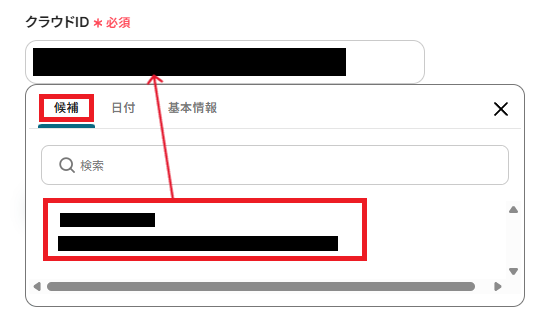 「クラウドID」は、入力欄をクリックして表示される候補から選択してください。