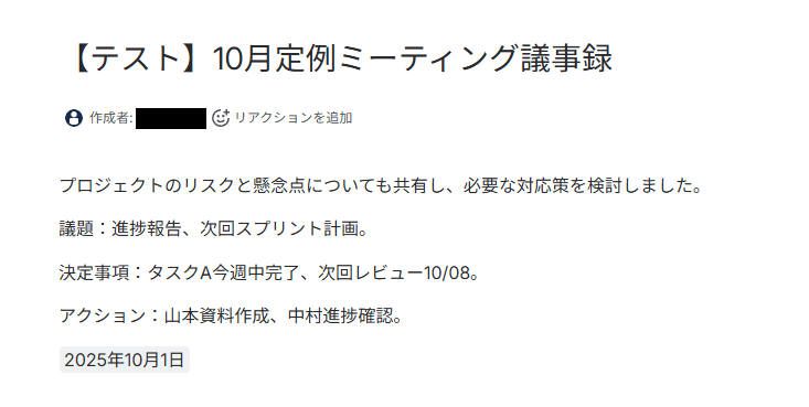これにより、会議後の記録作成や共有にかかる手間を軽減し、情報の見逃しを防ぎます。