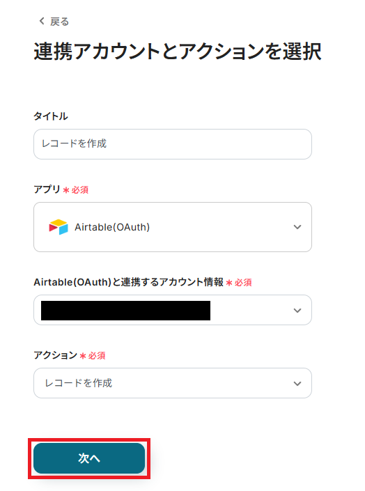 Airtableと連携するアカウントに間違いがないかを確認し、「次へ」をクリックしましょう。