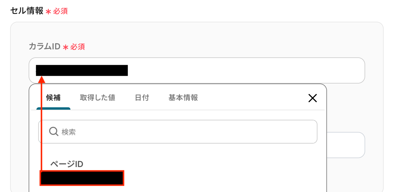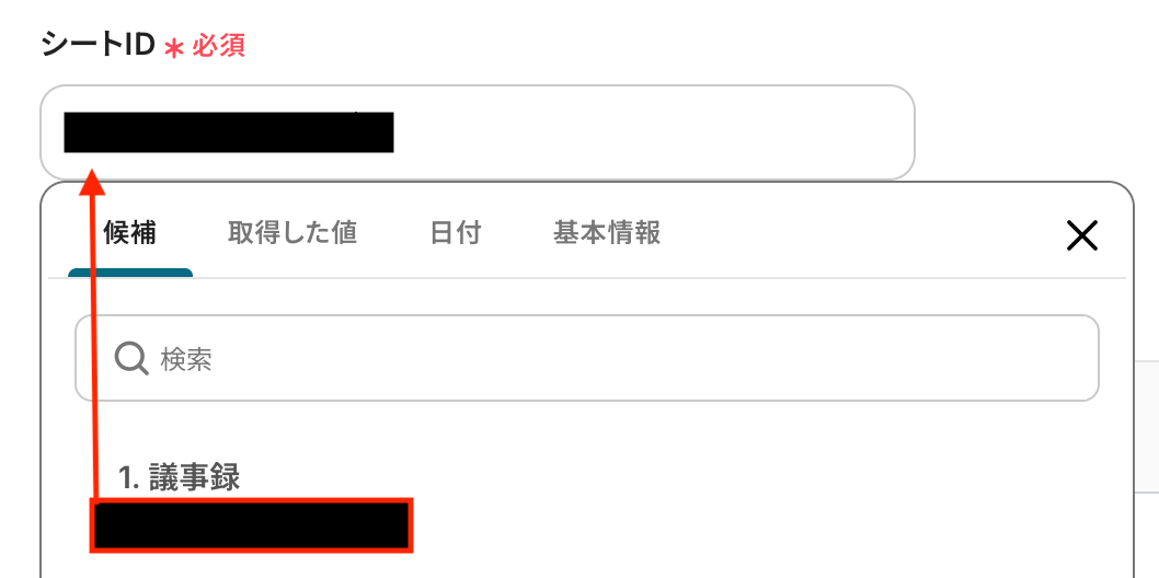 こちらも入力欄をクリックすると、先ほど設定したシートからカラムの候補が表示されるので対象の項目を選択しましょう。