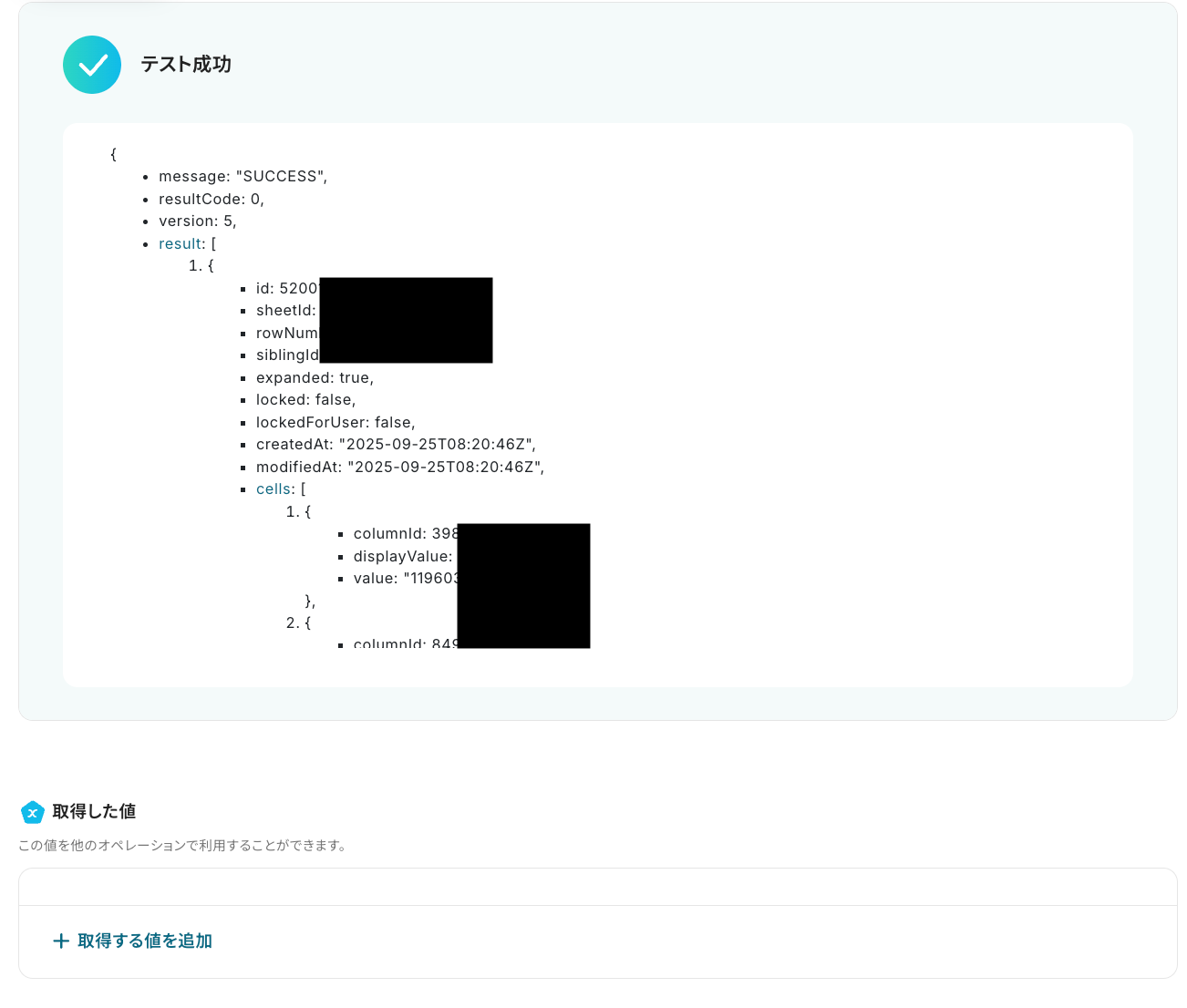以下の画像の取得した値を利用して、この後のステップでSmartsheetに行を追加できます。