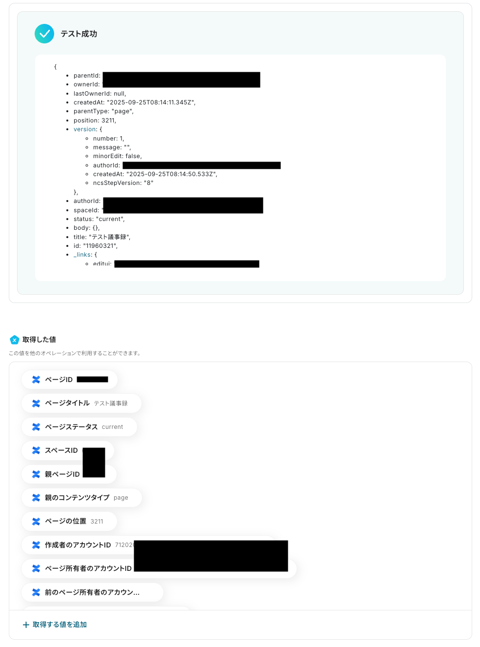 テストに成功すると、Confluenceに作成されたページに関する情報が一覧で表示されます。