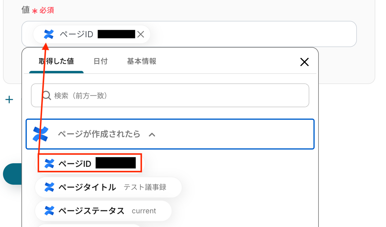 入力欄をクリックすると、前のステップでConfluenceから取得した値が表示されるので、選択して入力してください。