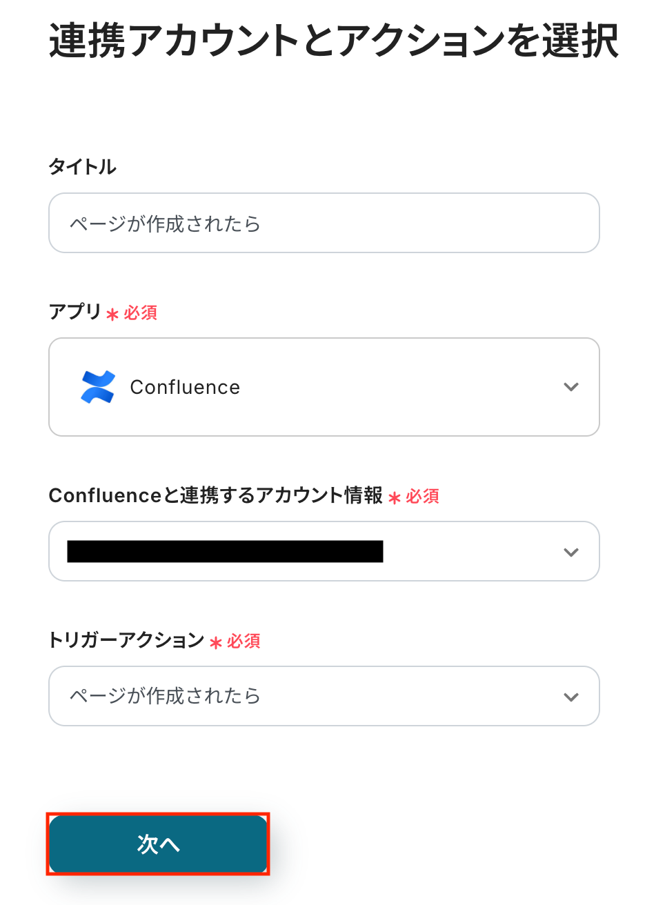 Confluenceと連携するアカウント情報に問題がなければ、「次へ」をクリックします。