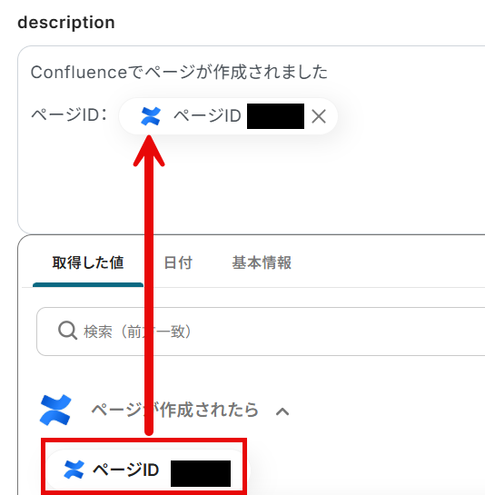 「content」と「description」には前項で取得した値から「ページタイトル」「ページID」を使用します。