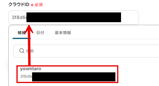 ページを作成したらYoomに戻り、クラウドIDを候補から選択します。