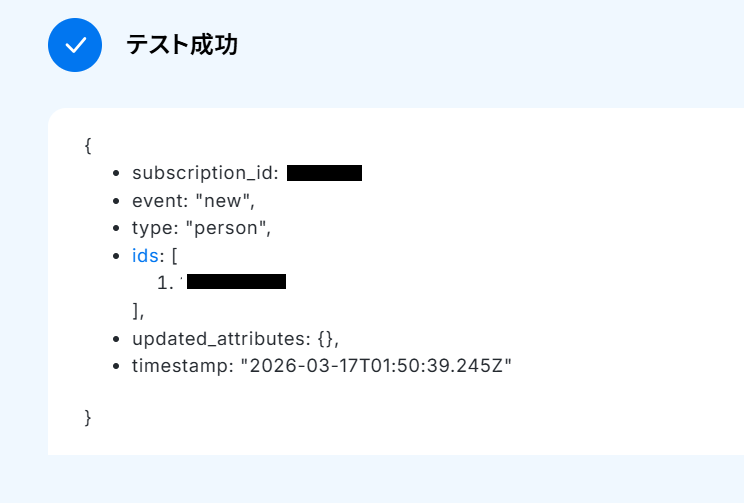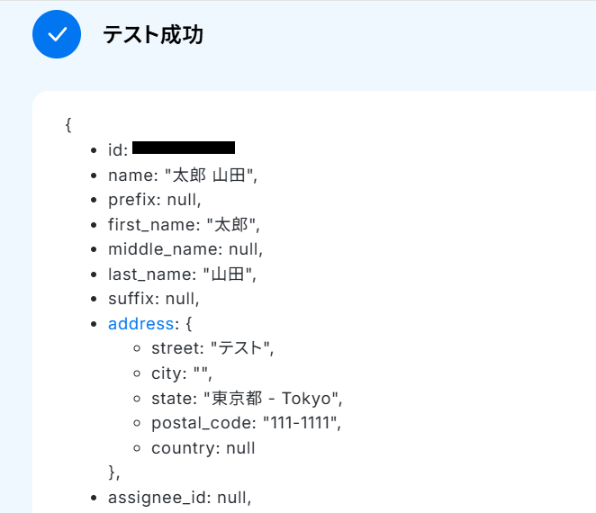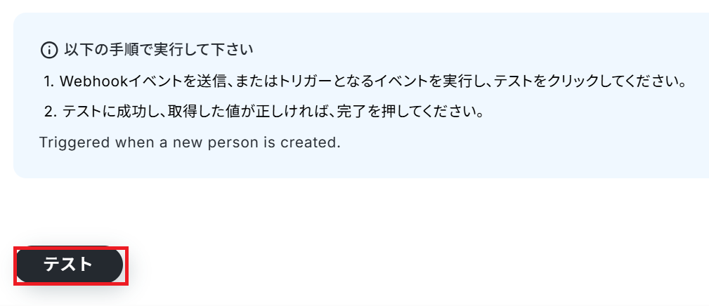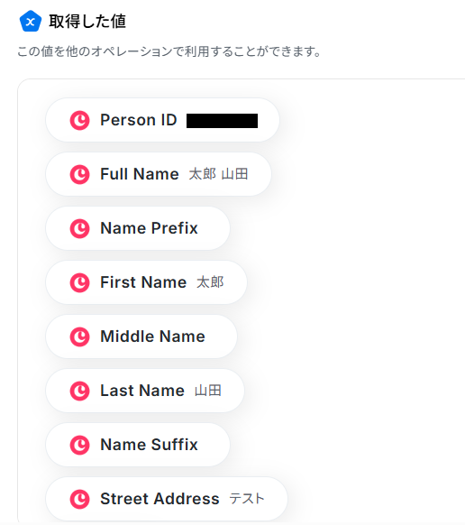 テストが成功すると、取得した値にCopperに作成したPersonの情報が反映されるので確認し、問題無ければ「完了」ボタンをクリックしてください。
