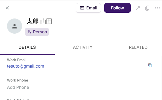Copperにログインし、テスト用のNew Personを作成してください。(テスト使用のため、架空の設定で問題ありません。)