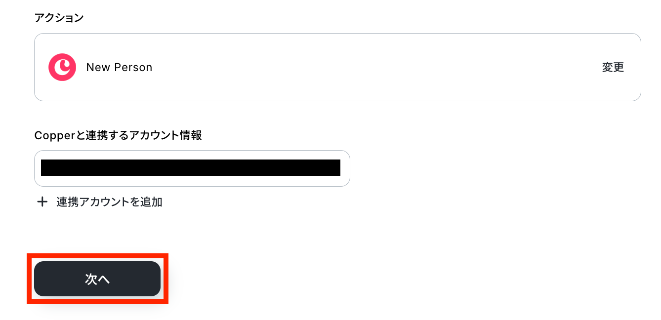 - 次に、トリガーでCopperを選択し、「New Person」というアクションを設定します。