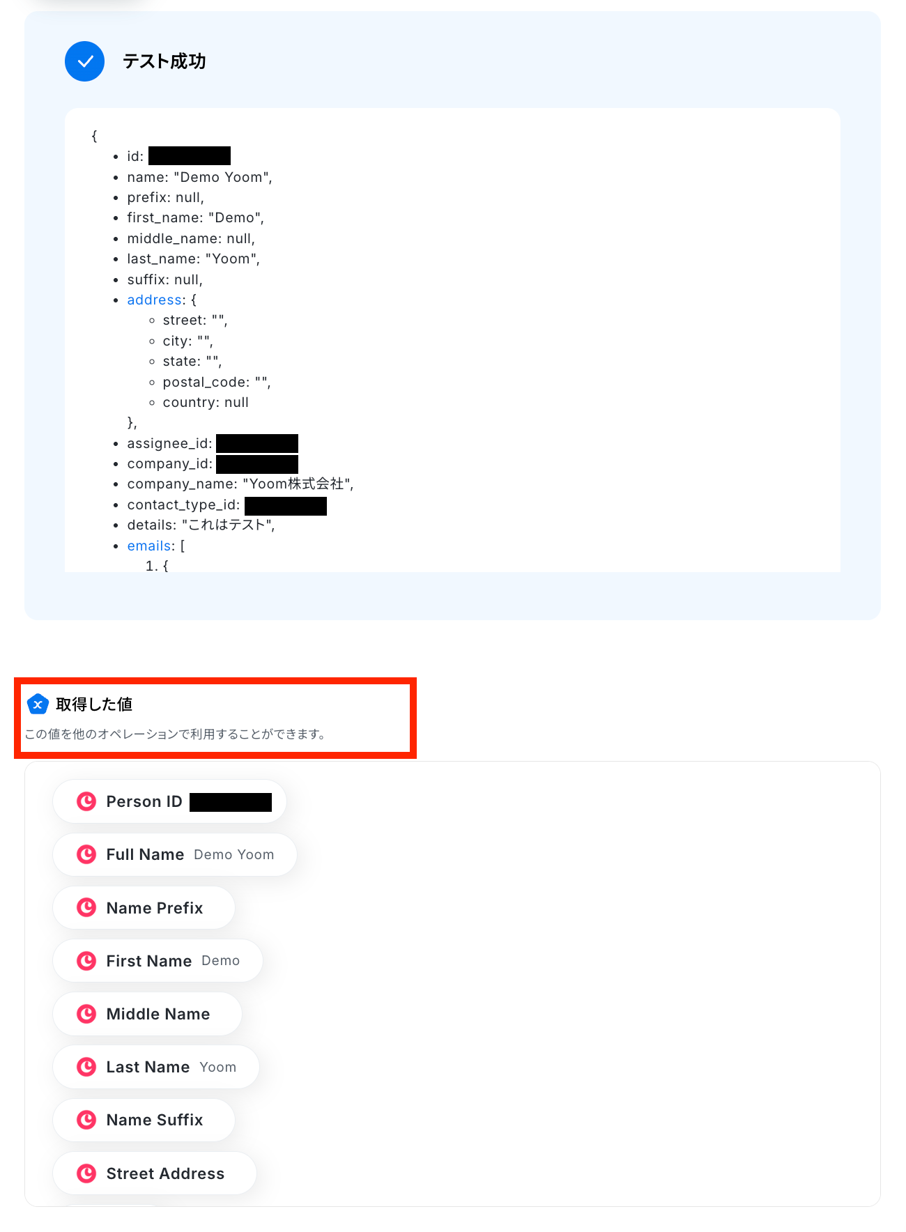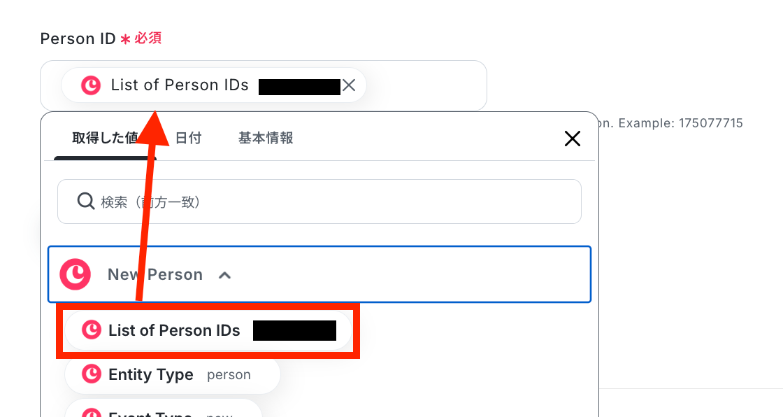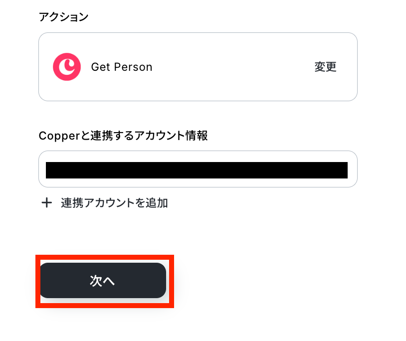 - 次に、オペレーションでCopperの「Get Person」アクションを設定し、トリガーで取得したPersonの詳細情報を取得します。
