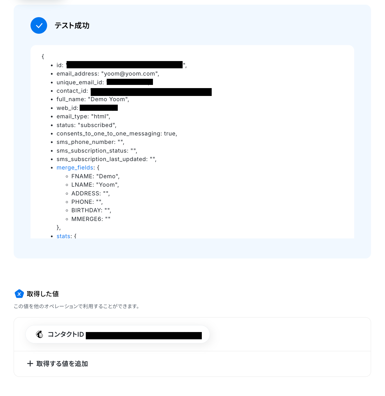 これまでに取得した値を使用して、Mailchimpにコンタクトを追加する設定を行います。