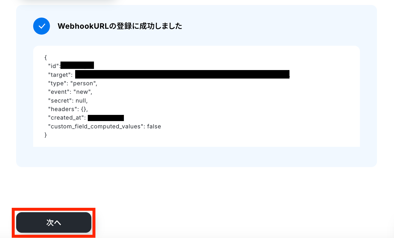 WebhookURLの登録成功を確認したら、「次へ」をクリックします。