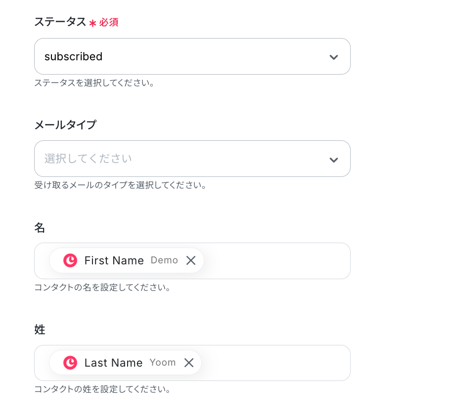 - Mailchimpの各フィールド(氏名、メールアドレスなど)に、トリガーで取得したBカートの注文情報や固定値を自由に割り当てて設定できます。